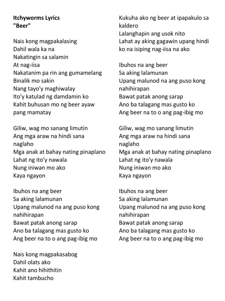 At nag-iisa nakatanim pa rin ang gumamelang binalik mo sakin nang tayoy maghiwalay itoy katulad ng damdamin ko kahit buhusan mo ng beer ayaw pang mamatay giliw wag mo sanang limutin ang mga araw na hindi sana naglaho mga anak at bahay nating pinaplano lahat ng itoy nawala nung iniwan mo ako kaya ngayon ibuhos na ang beer sa aking lalamunan. Tablatures and chords are parodiesinterpretations of the original songs. Nais kong magpakalasing Dahil wala ka na Nakatingin sa salamin At nag-iisa Nakatanim pa rin Ang gumamelang Binalik mo sakin nang tayoy Maghiwalay Itoy katulad Ng damdamin ko Kahit buhusan ko ng beer Ayaw pang mamatay Pre-chorus.