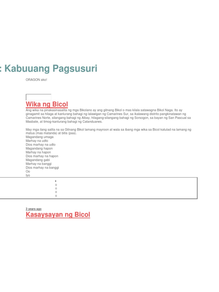 I-download ang lahat ng mga pahina 1-24. May mga ilang salita na sa Gitnang Bikol lamang mayroon at wala sa ibang mga wika sa Bicol katulad na lamang ng matua mas matanda at bitis paa. Ang ibang wikain ng Sebwano ay nabibigyan ng ibat ibang pangalan ang wika.