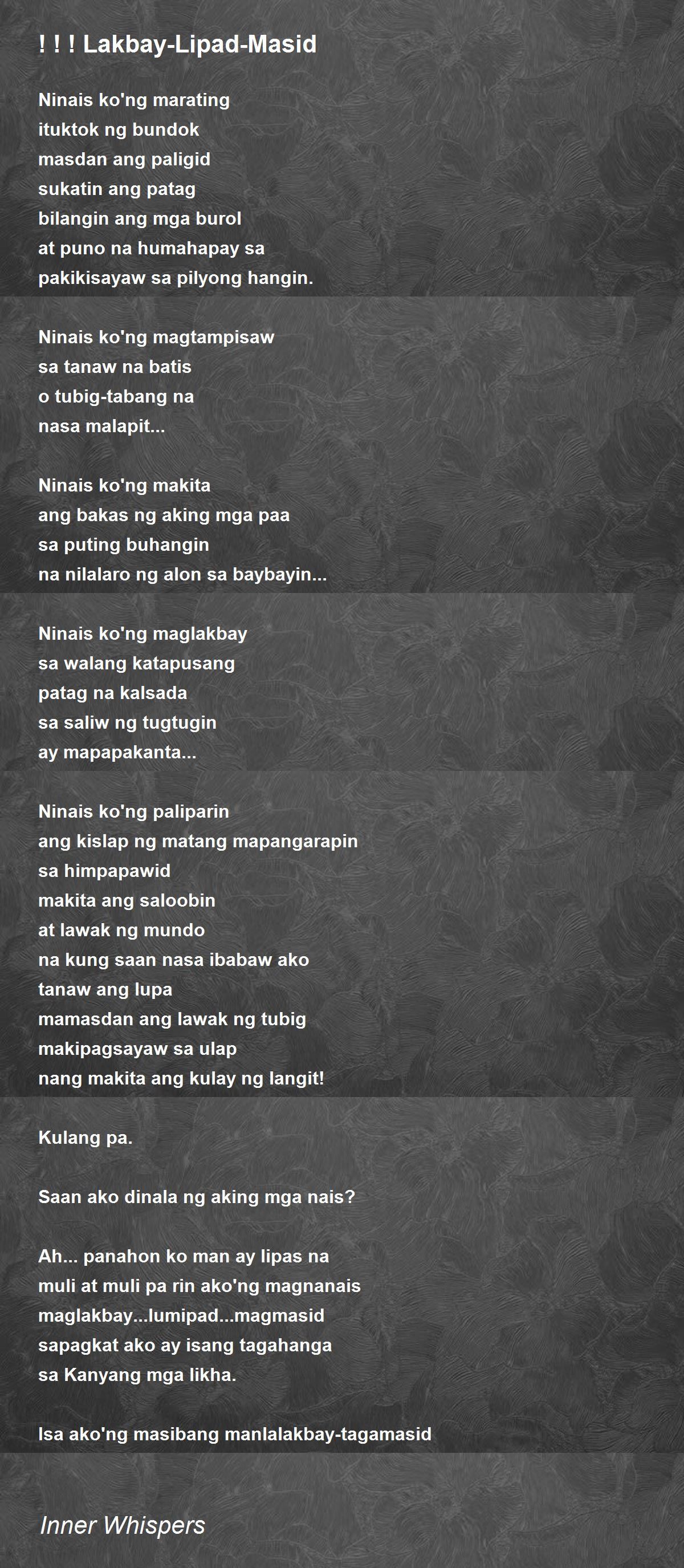 Nais kong liparin ang himpapawid At maabot ang ulap at langit Nais kong marating ang asul na dagat At languyin ang kanyang rikit Nais kong mahiga sa kandungan ni ina At lasapin ang kanyang mga haplos Nais kong marating ang paraiso Upang Doon ay magpahinga nitong Pagod kong puso Sa pangarap lang makakamtan Ang inaaasam Sa pangarap lang.