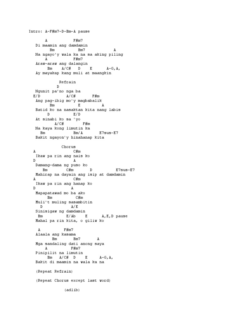 Intro Bm Em A D Cm F7 Bm A G Cm F7 Bm Em Bakit ba nang mawalay ka sa piling ko A D Ikaw pa rin ang laging hanap hanap ko Cm7 F7 Bm A G Sa damdamin ay palaging naroon ka Cm7 F7 Ang kasa kasama ko ay alaala Bm Em Alam mo na nagkamali ako sa yo A D.