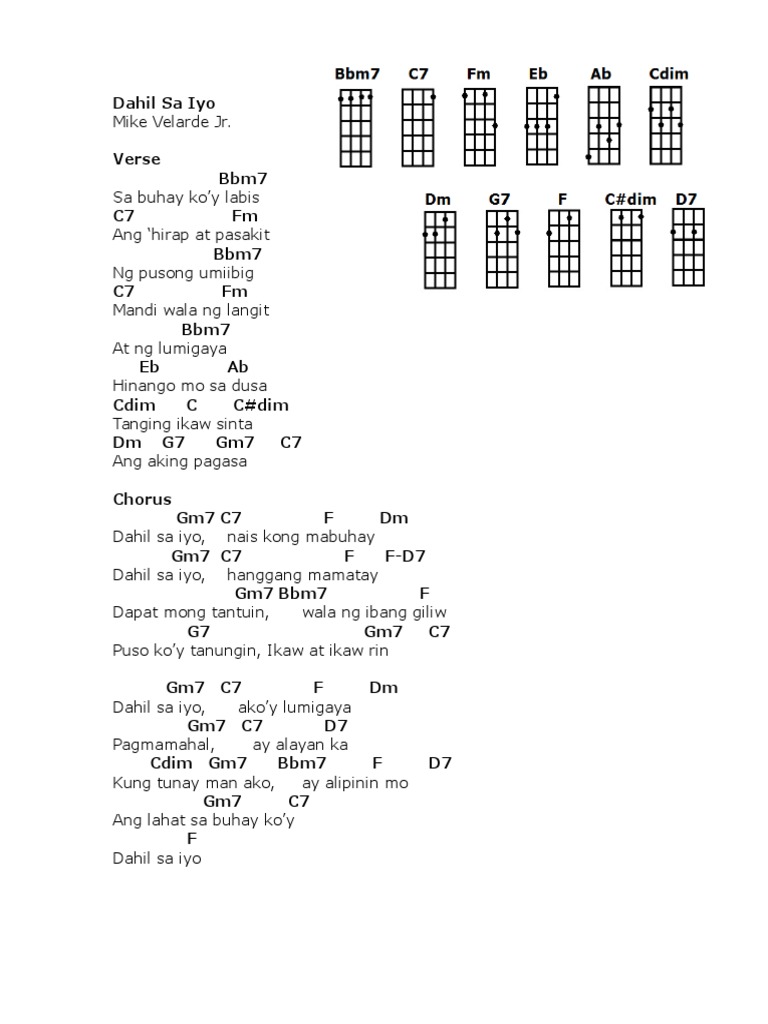 Dahil sa yo akoy lumigaya Pagmamahal ay alayan ka Kung tunay. Dahil Sa iyo Nais kong mabuhay Dahil Sa iyo hanggang mamatay Dapat mong tantuin Wala nang ibang giliw Puso koy tanungin ikaw at ikaw rin. Intro Cm Fm G Cm Fm G Cm Verse Fm G Sa buhay koy labis Cm Ang hirap at pasakit Fm G Ng pusong umiibig Cm Mandiy wala ng langit Fm Bb At nang lumigaya Eb Hinango mo sa dusa Gdim D Tanging ikaw sinta A D G Ang aking pag asa Adim Dm G CM7 Am Dahil sa yo nais kong mabuhay Dm G C Dahil sa yo hanggang mamatay F Fm Dapat mong tantuin C.