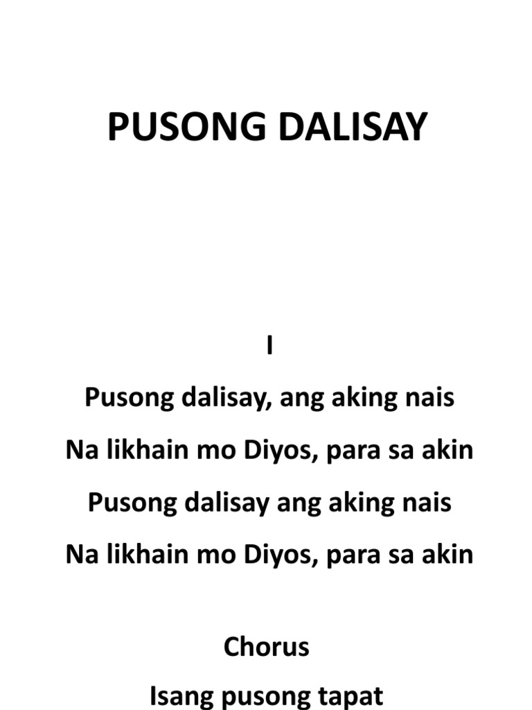 Pusong dalisay ang aking nais. Isang pusong itinitibok na ikaw ay parangalan. Pusong dalisay ang aking naisNa likhain mo O Diyos para sa akin Isang pusong tapat na sa iyoy nagmamahal Isang pusong sa iyoy walang alinlanganIsang pusong itinitibok ang ikay parangalan.