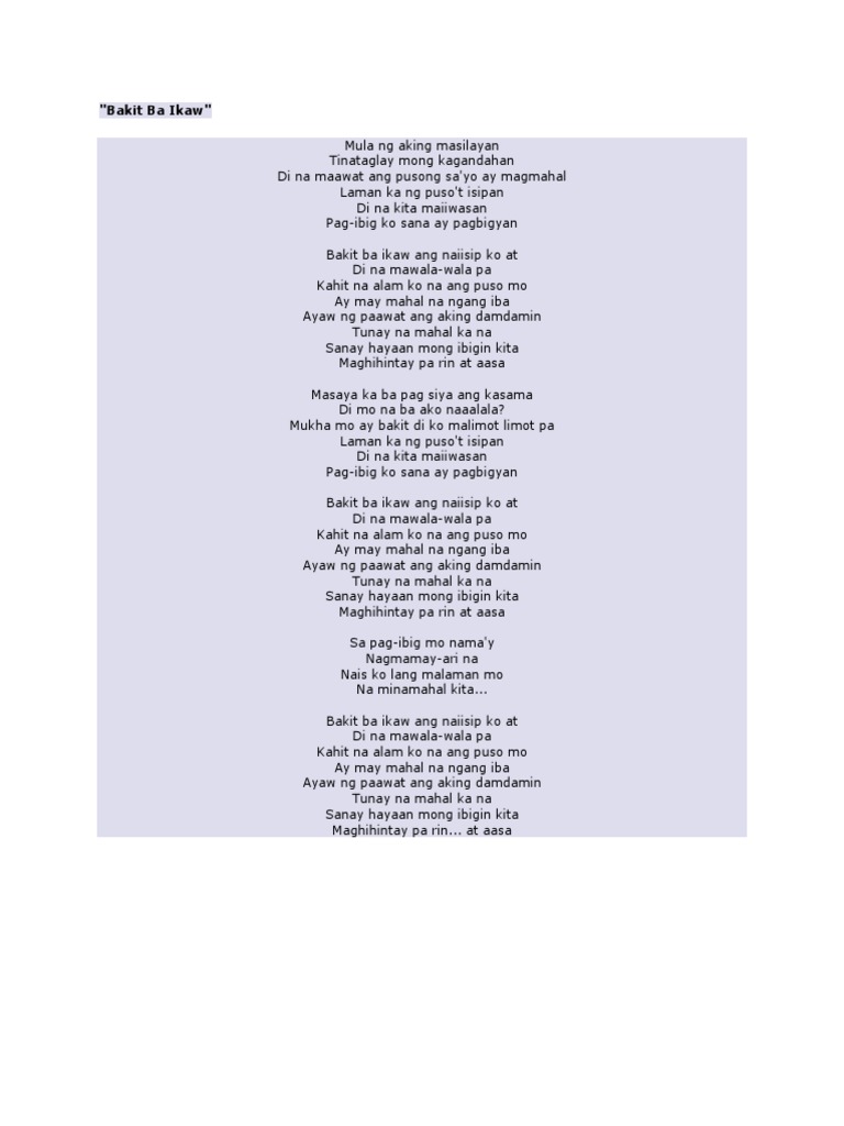 Ikaw Ang Nasa Isip Ko Ang Nais Ko Ay Malaman Mo Na Mahal Kita lyrics. Ikaw lang naman ang tanging laman Ng aking isipan Ikaw lang naman ang tanging mahal Nitong aking puso Kahit na may ibang Gustong agawin ang yong pagsinta Ngunit pag-ibig koy ikaw lamang Sa. Kalimutan ang kahapon di pe-pwede yon sa akin.